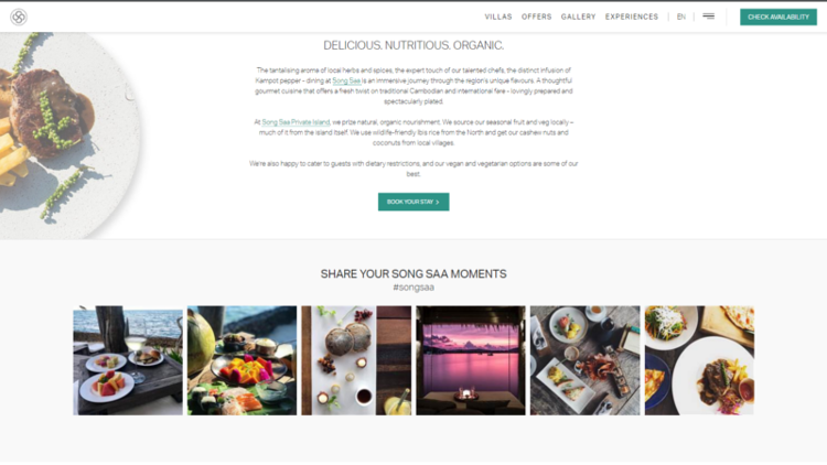 - Putting user generated content to the forefront, this layout makes excellent use of the hotel’s stunning Instagram images taken by guests. A dedicated hashtag #songsaa invites visitors to start a social