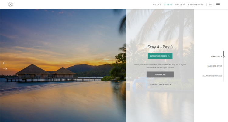 - Offering a design that is unique to this website, the special offers and accommodation pages have a horizontal layout that requires minimal scrolling. The resort has a large number of room types: this design gives an immediate snapshot of all options and presents content concisely.