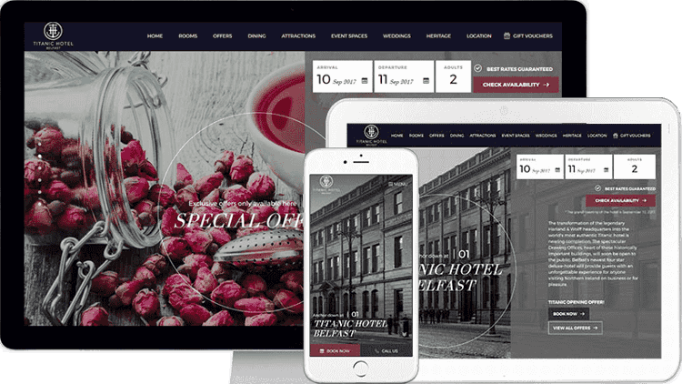 A split screen design for this hotel’s website blends both new and old imagery to highlight the journey of the building from the iconic Harland and Wolff offices, to a sensitive hotel restoration that will open in September 2017.